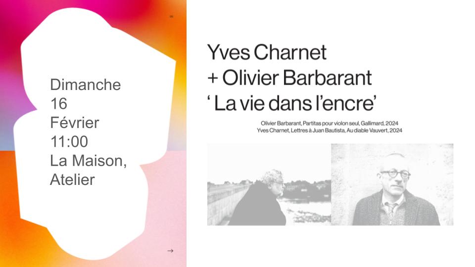 Yves Charnet et Olivier Barbarant se connaissent depuis longtemps. Ils ont croisé les mêmes aînés, arpenté les revues en débutants gémellaires (aussi ont-ils obtenu leurs concours la même année). Ils se sont « perdus de vue » sans cesser de se lire. Ils se sont retrouvés voilà quelque temps, avec le sentiment que par des voies différentes, ils tournaient dans leurs écrits l’un et l’autre autour d’un même objet (n’est-ce pas plutôt un sujet ?) La plongée d’Yves Charnet dans l’autofiction, l’incessante autobiographie alimentant la poésie d’Olivier Barbarant renvoient chez l’un comme chez l’autre à la nécessité de s’expliquer avec la vie, ou de la rejoindre, ou d’en porter témoignage, ou… quoi ? Que fait-on de la vie dans l’encre, que fait-on de sa vie ? Et pourquoi ?