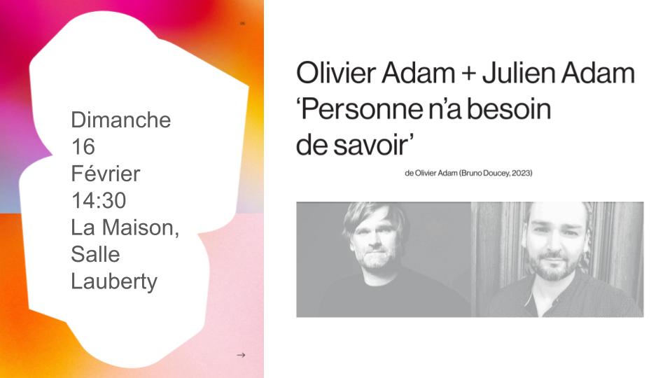« partout je me suis toujours cherché / mais j’ai toujours veillé / à ne jamais me trouver / de peur de me faire mal / de me faire la peau / de me régler enfin / mon compte. » Il y a l’empreinte d’un Georges Perros dans cette façon de se regarder en face. Franche. Désolée. Il y a surtout le premier et très inspiré recueil de poèmes d’Olivier Adam, fragments murmurés d’une « contrevie ». Du passé bien passé, bien perdu. Des manquements, des remords, des incompréhensions, des impossibilités à jouer la comédie. Ce rôle-là, il ne le tient pas « de travers ». Tout au contraire : c’est sa peau. Les deux frères ont adapté le recueil pour en faire un concert poétique.