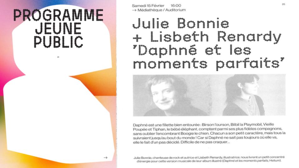 Daphné est une fillette bien entourée : Birson l’ourson, Bilbil la Playmobil, Vieille Poupée et Tiphan, le bébé éléphant, comptent parmi ses plus fidèles compagnons, sans oublier l’encombrant Boogie le chien. Chacun a son petit caractère, mais tous la suivraient jusqu’au bout du monde ! Car si Daphné ne sait pas toujours où elle va, elle le fait d’un pas décidé. Difficile de ne pas craquer…Julie Bonnie, chanteuse de rock et autrice et Lisbeth Renardy illustratrice nous livrent un petit concentré d’énergie pour cette version musicale de leur album illustré (Daphné et les moments parfaits, Helium).