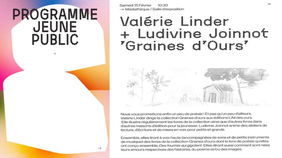 Ensemble, elles liront à voix haute (accompagnées de sons et de petits instruments de musique) des livres de la collection Graines d’ours dont le livre de poésie qu’elles ont conçu ensemble, Des fourmis qui gigotent. Elles diront aussi comment sont nées leurs amours respectives des histoires, du poème et/ou des images.