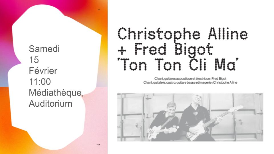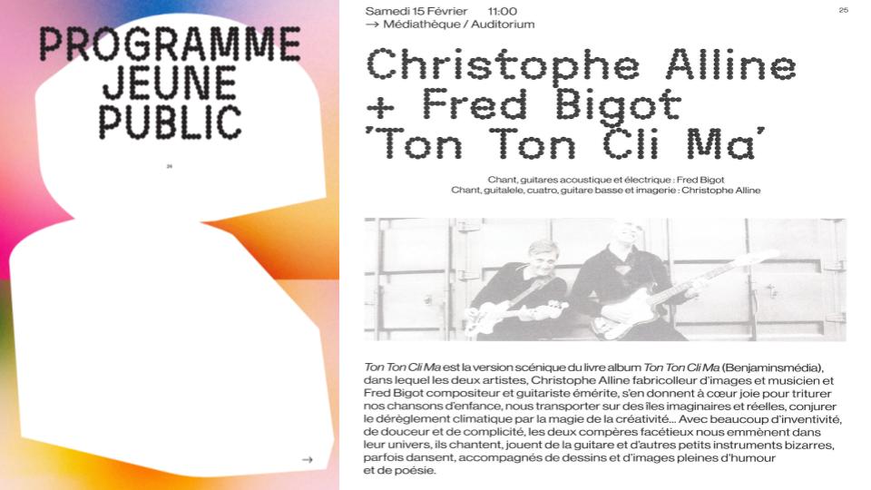 Ton Ton Cli Ma est la version scénique du livre album Ton Ton Cli Ma (Benjaminsmédia), dans lequel les deux artistes, Christophe Alline fabricolleur d’images, musicien et Fred Bigot compositeur et guitariste émérite, s’en donnent à cœur joie pour triturer nos chansons d’enfance, nous transporter sur des îles imaginaires et réelles, conjurer le dérèglement climatique par la magie de la créativité… Avec beaucoup d’inventivité, de douceur et de complicité, les deux compères facétieux nous emmènent dans leur univers, ils chantent, jouent de la guitare et d’autres petits instruments bizarres, parfois dansent, accompagnés de dessins et d’images pleines d’humour et de poésie.